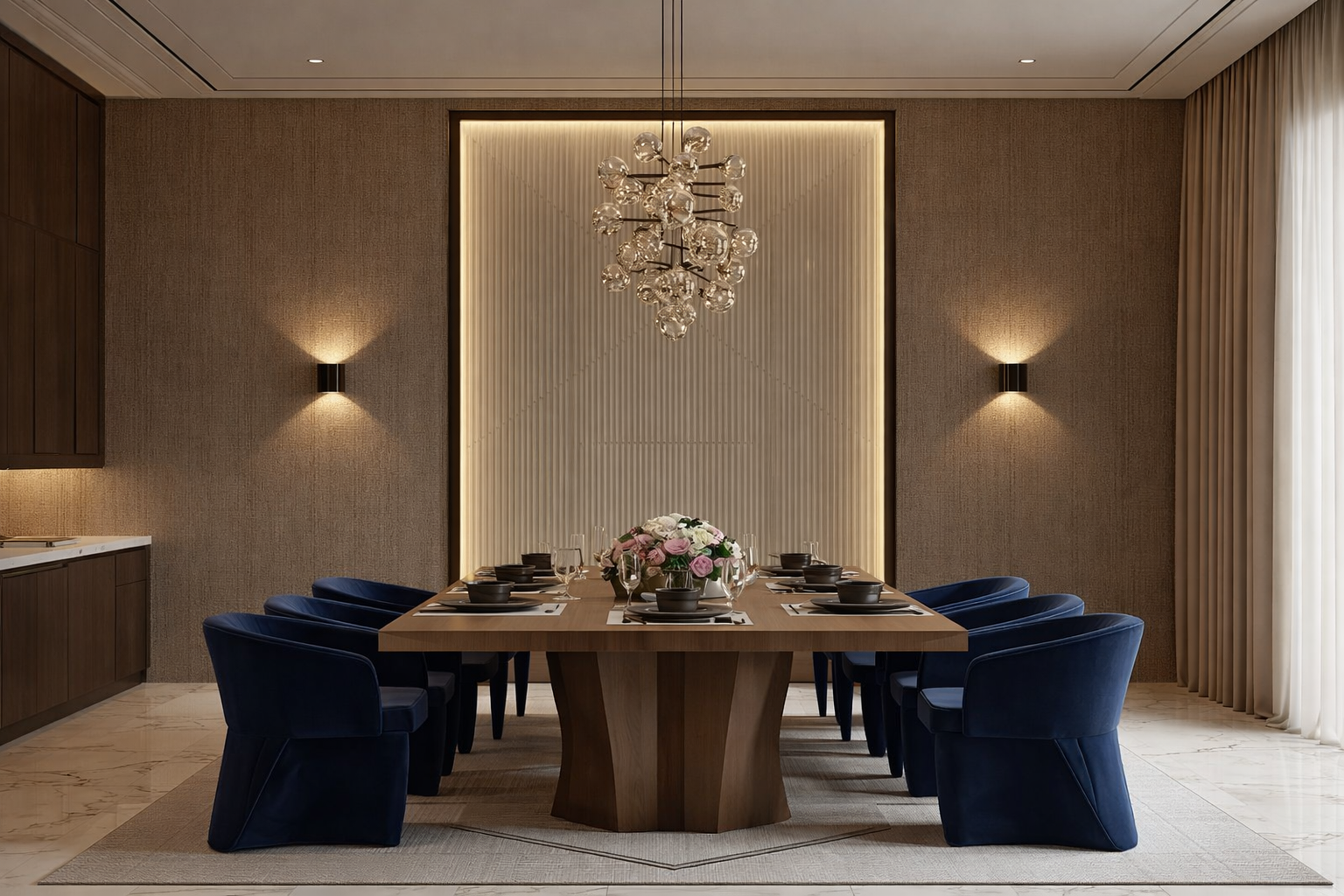 The Elegant Dining Set adds a touch of luxury and refinement to any dining space. Featuring a beautifully crafted wooden table with a sculptural base, it creates a bold statement while offering a functional and inviting area for dining. The deep blue velvet chairs provide both comfort and style, creating the perfect balance between elegance and practicality. Paired with soft lighting and modern decor, this dining set is perfect for both intimate meals and grand gatherings.