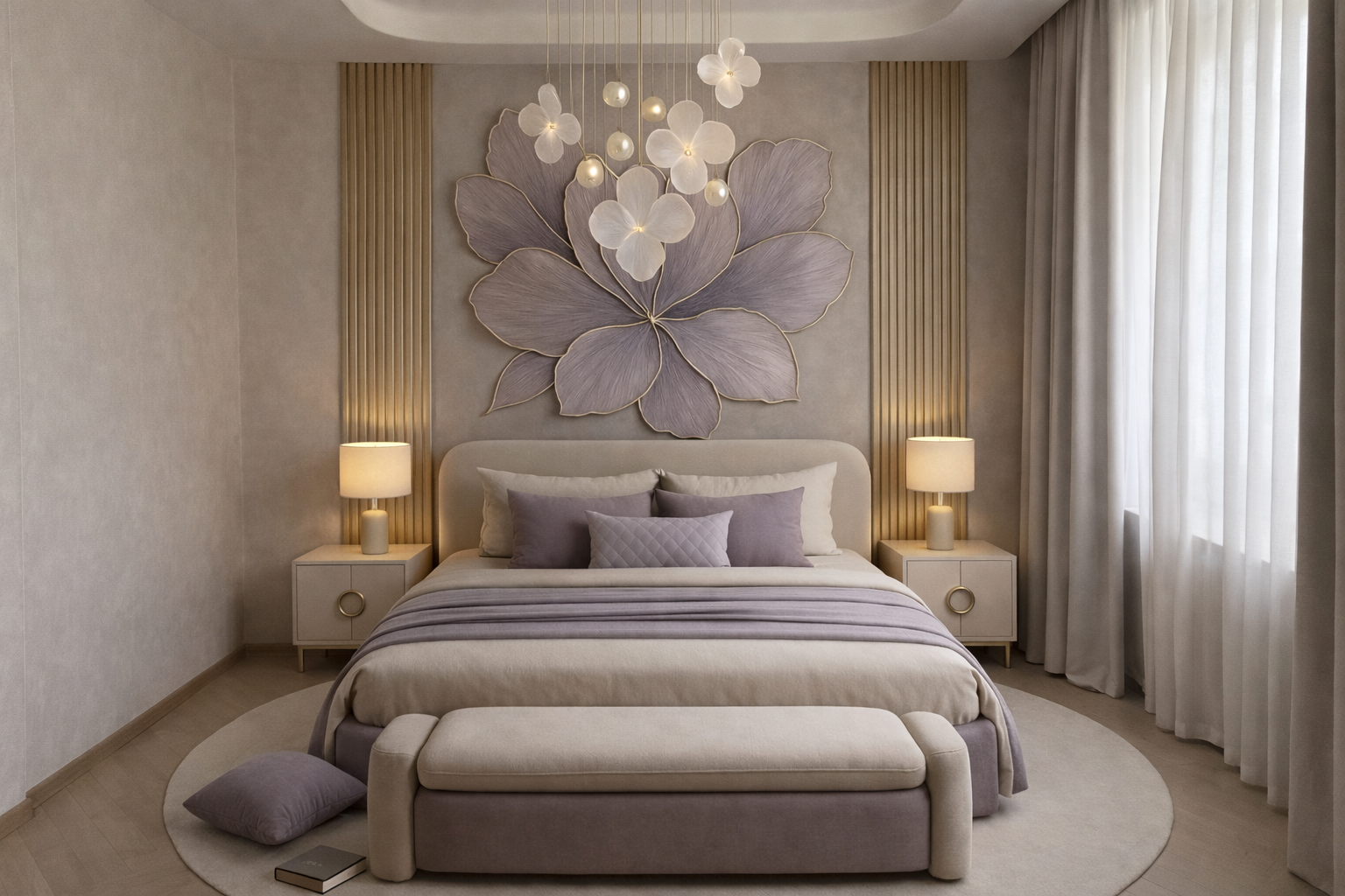 Floral Wall Art: A striking floral design on the wall above the bed adds a sense of tranquility and elegance, making the room feel more expansive and serene.