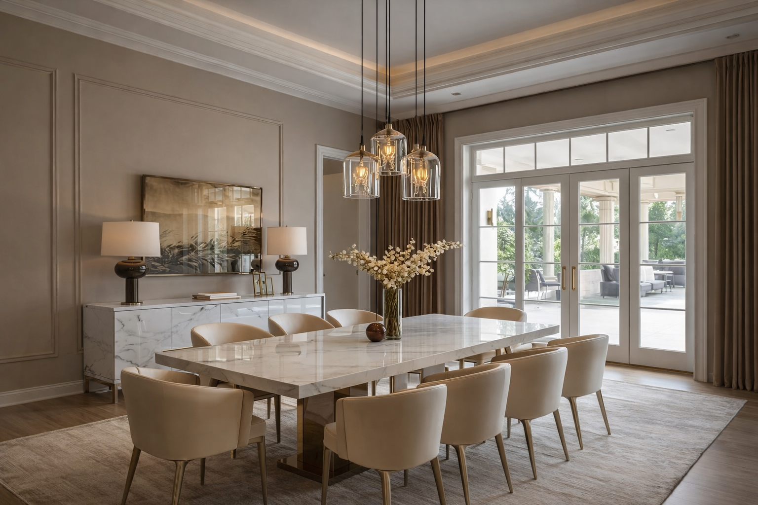 Contemporary Lighting: The pendant lights above the table cast a soft, warm glow, enhancing the elegant atmosphere of the dining area.